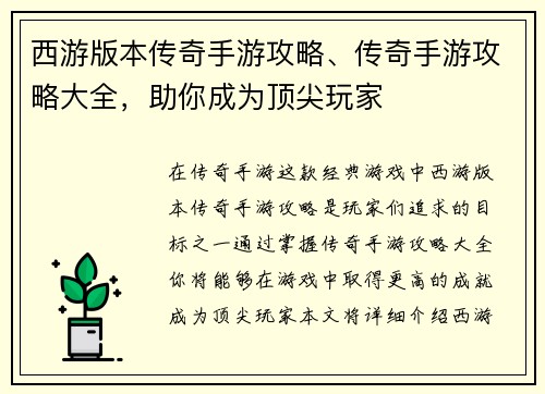 西游版本传奇手游攻略、传奇手游攻略大全,助你成为顶尖玩家